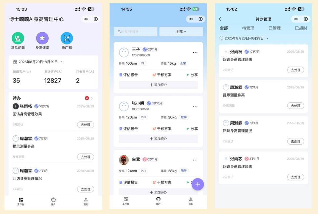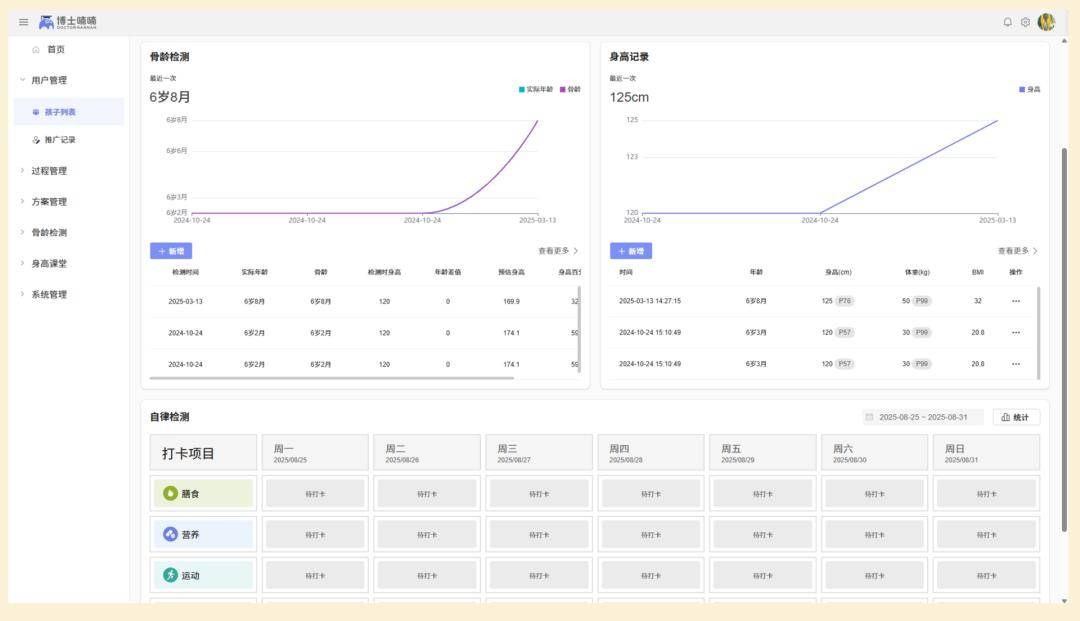 自主开发的AI身高管理师,评估骨龄、BMI、遗传身高、成年身高、身高百分位、饮食结构、营养补充、运动习惯、睡眠质量、情绪压力等情况,并自动生成个性化评估报告和定制化干预报告,并生成健康档案,同时具备健康习惯养成打卡、健康教育、健康咨询、异常数据预警等功能。
