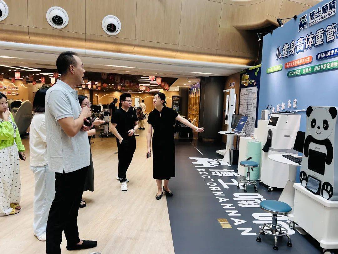 陈雨副局长一行实地走访了中心各大功能区,深入了解儿童健康服务的前沿实践。在健康研学科普馆,考察团接触了融合科学与趣味的健康知识普及方式;在身高体重管理中心与近视防控眼视光中心,详细询问了儿童生长发育监测及视力健康干预手段,并亲身体验了视力训练设备的实际效果;在儿童营养中心、学习困难指导中心及功能运动中心,重点关注了个性化评估与科学干预方案。
